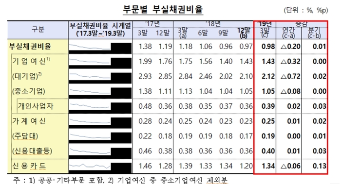 대기업여신(2.12%)은 전분기 말 대비 0.02%p, 개인사업자여신(0.39%)은 전분기 말 대비 0.03%p 상승했다. 중소기업여신(1.05%)은 전분기 말과 비슷한 수준을 보였다.