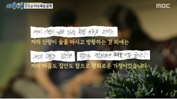 또 조두순이 술을 마시는 것에 대해서는 “저의 신랑이 술을 마시고 방황하는 것 외에는 저의 마음도 집안도 참으로 평화로운 가정이었다”고 말했다.