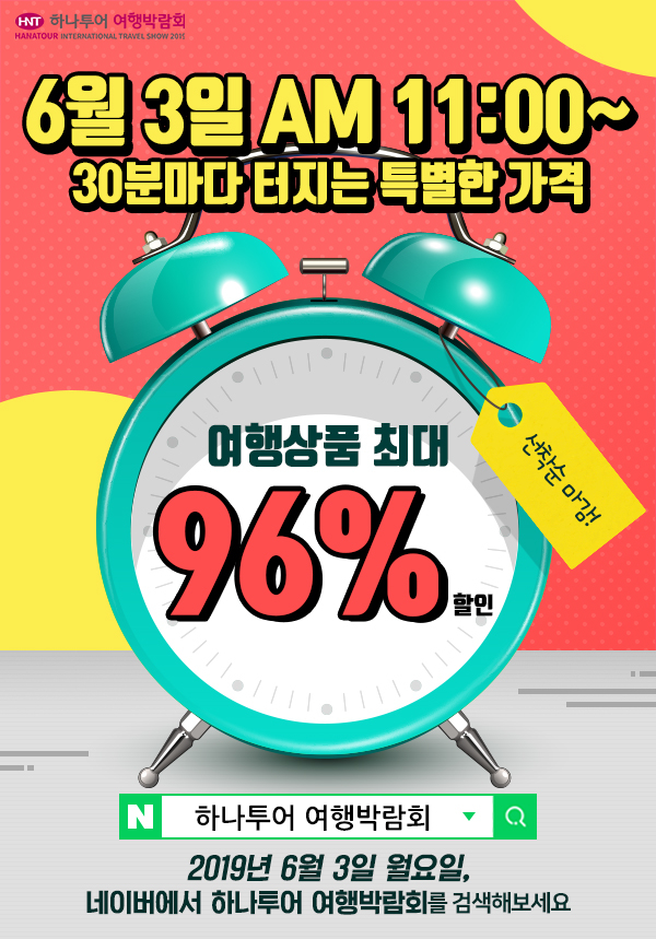 6월 3일 오전 11시부터 오후 4시까지, 하나투어 인기 여행 상품을 최대 96% 까지 할인된 가격으로 제공하는 여행박람회 오픈 기념 이벤트가 진행된다.