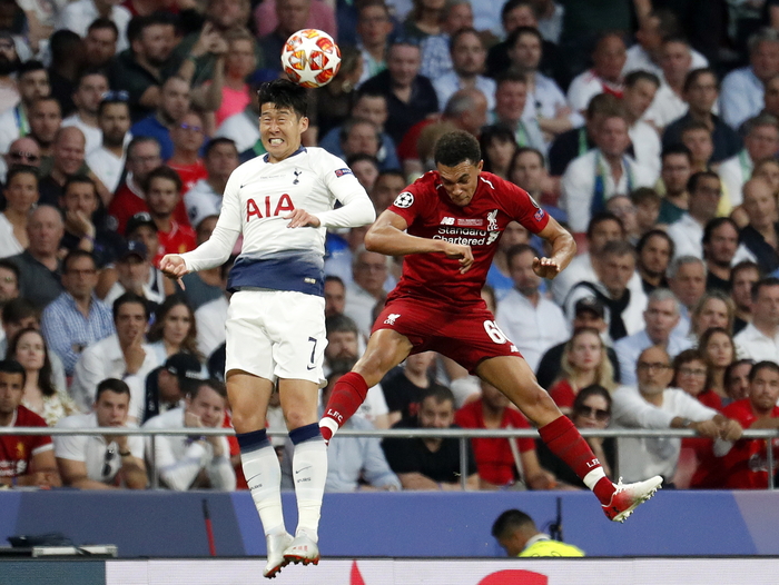 토트넘 손흥민이 1일(현지시간) 스페인 마드리드 에스타디오 메트로폴리타노에서 열린 리버풀과의 2018-19 유럽축구연맹 챔피언스리그에서 수비수와 공중볼을 경합하고 있다.