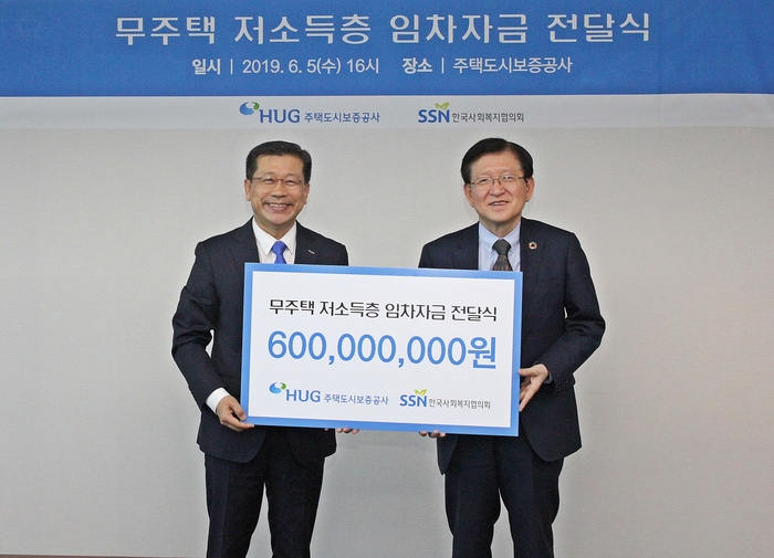 주택도시보증공사(HUG)는 무주택 저소득층에 임차자금을 지원하기 위한 후원금 6억원을 사회공헌 사업 협력기관인 한국사회복지협의회에 전달했다고 10일 밝혔다.