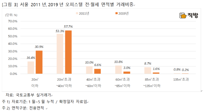 오피스텔 전·월세 실거래 공개가 시작된 2011년과 올해의 전·월세 면적별 거래 비중을 비교했더니 전용 20㎡ 이하와 전용 20∼40㎡에서 거래 비중이 각각 14.5%포인트, 4.4%p 증가했다.