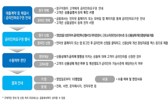 금리인하 요구권은 취업, 승진, 재산증가(개인), 재무상태 개선(기업), 신용평가 등급 상승 등 신용상태의 개선이 발생했을 때 요구할 수 있다. 금융회사는 고객의 요구에 따라 대출상품의 금리가 차주의 신용상태에 따라 변동되는 상품인지, 신용상태 변화가 금리에 영향을 줄 정도인지 등을 검토해 수용여부를 결정해야 한다.
