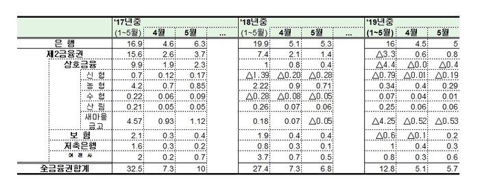 한편 올해 5월까지의 누적 금융권 가계대출 증가액은 총 12조8000억원을 기록했다. 이는 지난해와 비교할 때 14조6000억원 덜 증가한 규모다.