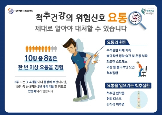 김은상 대한척추신경외과학회장은 “요통이 장기간 이어지면 척추질환을 의심해 봐야 하지만 대수롭지 않게 생각해 방치하는 경우가 많다”면서 “요통은 척추 건강의 위험신호인 만큼, 요통을 겪고 있는 많은 국민이 조기에 정확한 진단을 받아야 한다”고 강조했다.