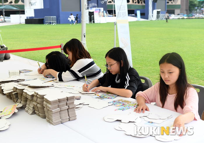 19일 오후 서울광장에서 개최된 '2019 서울 보도블록 엑스포'에서 어린이들이 나만의 블록 만들기를 체험하고 있다.