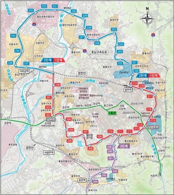 이번에 사업계획 승인을 받은 1단계 구간은 광주시청에서 월드컵경기장을 거쳐 광주역까지 약 17㎞를 연결한다. 2단계 구간은 광주역에서 전남대, 수완지구를 거쳐 광주시청까지의 20㎞를 연결해 1단계와 순환망을 이루게 된다. 3단계 구간은 백운광장에서 진월을 거쳐 효천역을 잇는 지선 4.8㎞다. 1단계는 오는 2023년 완공된다. 2단계의 경우 2021년 상반기 설계를 마치고 착공에 들어갈 예정이며, 3단계 구간은 2021년 상반기 설계에 착수할 예정이다.