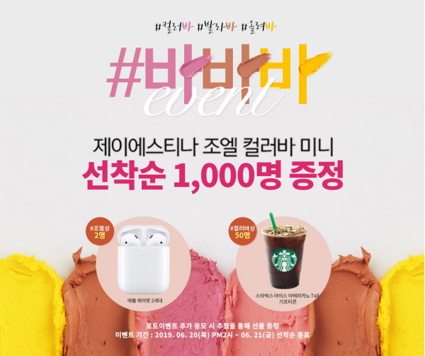 6월 20일 목요일 오후 2시부터 선착순 1,000명에게 증정하는 ‘바바바 이벤트’는 제이에스티나 공식 홈페이지에서 응모 가능하며, 이와 함께 조엘 컬러바 포토 리뷰 이벤트 추가 응모시 추첨을 통해 에어팟 2세대, 스타벅스 기프티콘 등을 증정한다.