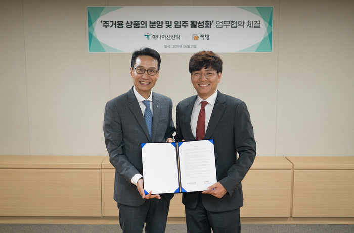 부동산 정보 플랫폼 직방은 21일 부동산 종합자산관리회사 하나자산신탁과 분양 및 입주 활성화를 위한 업무협약(MOU)을 맺었다고 밝혔다.