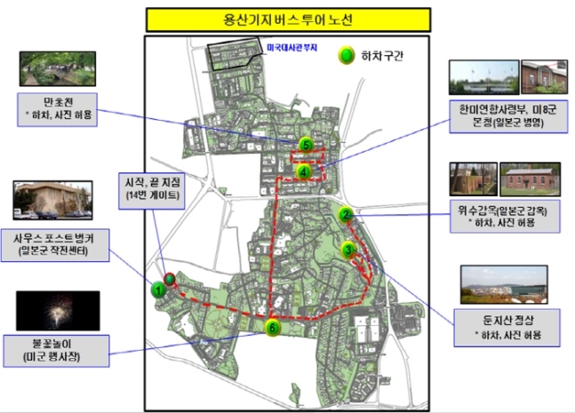 행사 당일 참가자들은 저녁 5시20분까지 용산갤러리에 모여 버스에 탑승, 용산기지 내 주요 관람 지점인 위수감옥, 둔지산 정상, 만초천 등을 관람한 후 미군 측이 준비한 행사장에서 저녁 9시까지 공연 및 불꽃놀이를 즐길 예정이다.