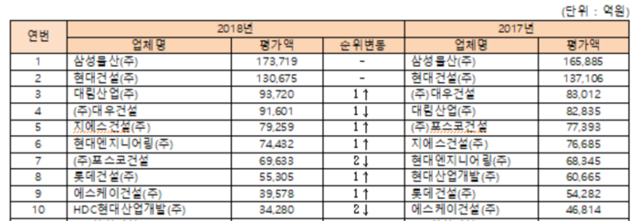 국토부의 2018년 시공능력 평가 결과에 따르면 토목건축공사업에서 삼성물산이 17조3719억원으로 5년 연속 1위를 차지했다. 그 아래로 ▲2위 현대건설 13조675억원 ▲3위 대림산업 9조3720억원 ▲4위 대우건설 9조1601억원 ▲5위 GS건설 7조9259억원 ▲6위 현대엔지니어링 7조4432억원 ▲7위 포스코건설 6조9633억원 ▲8위 롯데건설 5조5305억원 ▲9위 SK건설 3조9578억원 ▲10위 HDC현대산업개발 3조4280억원 순이었다.