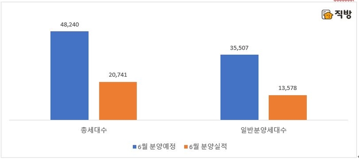 5월에 조사한 6월 분양예정단지는 58개 단지, 총 4만8240세대, 일반분양 3만5507세대였다. 이 중 실제 분양이 이루어진 단지는 29개 단지, 총 2만741세대(43%), 일반분양 1만3578세대(38%)로 조사돼 계획 대비 절반에도 미치지 못했다.