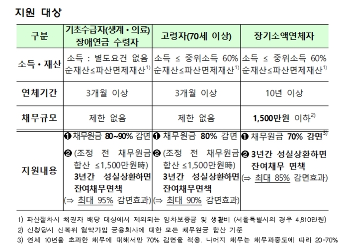 지원 대상은 기초생활수급자 및 장애연금 수령자, 만 70세 이상 고령자, 1500만원 이하의 채무를 10년 이상 연체중인 장기소액연체자 가운데 소득과 재산이 일정 기준 이하인 취약계층이다.