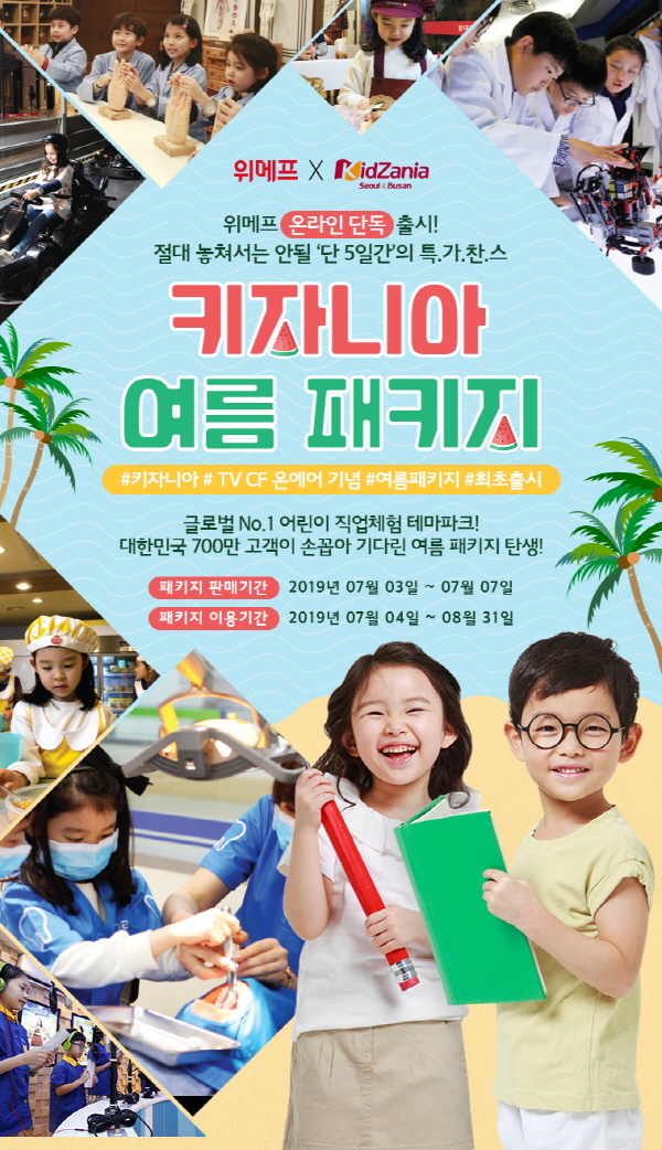 위메프가 여름 방학을 맞아 어린이 글로벌 직업체험 테마파크 ‘키자니아’ 여름 패키지를 선보인다고 3일 밝혔다.