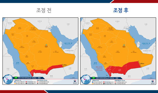 외교부에 따르면 이번 여행경보단계 조정은 최근 예멘 후티 반군의 사우디아라비아 공격이 빈발하고 있고 해당 접경지역 인근에 공격이 집중되고 있는 상황을 감안한 조치다.