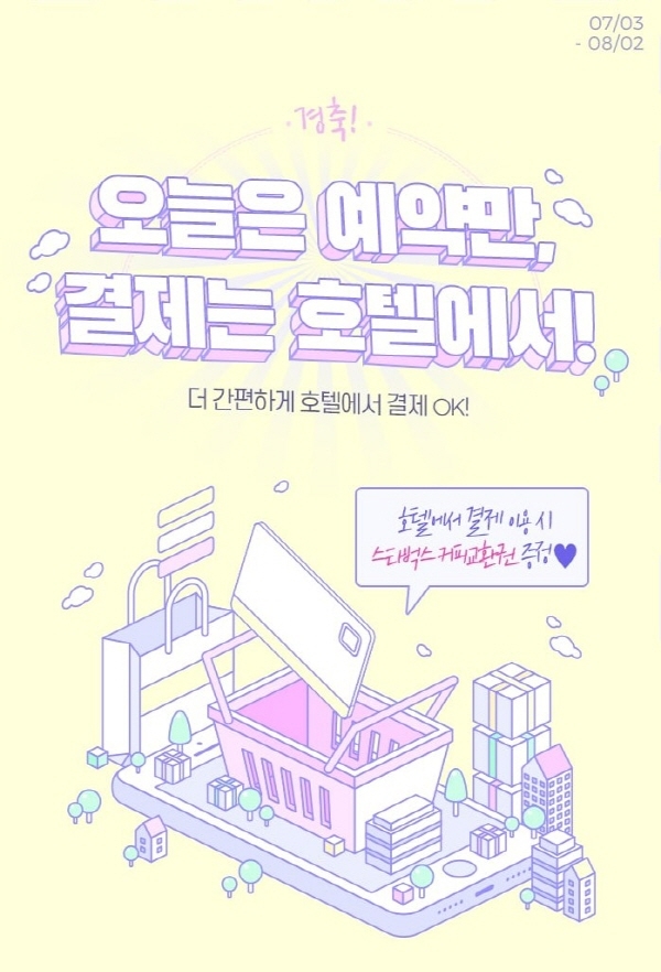 호텔엔조이 측은 해당 결제시스템 런칭을 기념해 이벤트를 진행한다고 밝혔다. ‘호텔에서결제’를 이용하는 고객은 스타벅스 아메리카노 교환권을 받을 수 있다. 커피 교환권은 체크아웃을 확인한 뒤 해당 고객들에게 순차적으로 발송된다.