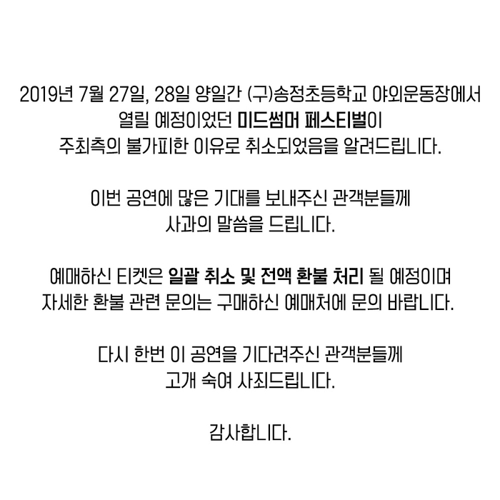 ‘미드 썸머 페스티벌’ 측은 "다시 한 번 이 공연을 기다려주신 관객 분들께 고개 숙여 사죄드린다”고 강조하기도 했다.