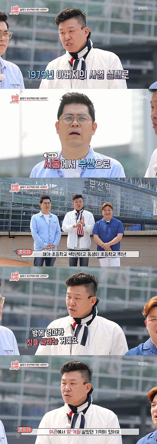 이날 홍록기는 부산역 앞에서 MC들과 오프닝을 진행하며 "79년에 아버지 사업 실패로 갑자기 부산에 오게 됐다"고 말했다.