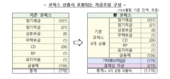 은행은 그동안 8개 상품 외에도 다양한 방식으로 대출재원을 조달해 왔지만 코픽스에 8개 상품만 반영해 코픽스 금리를 산출해 왔다. 금융당국은 8개 상품만으로 정확한 은행의 조달비용 산출이 어렵다는 판단에 따라 결제성자금, 중기 대출을 위한 정부·한은 차입금 등을 반영해 새로운 잔액기준 코픽스 금리를 도입하기로 결정했다.
