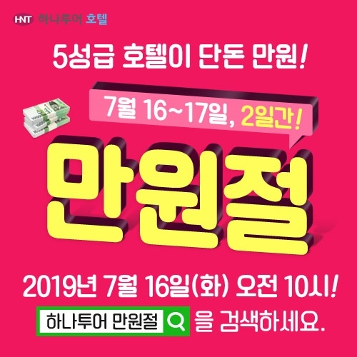 하나투어(대표이사 김진국)는 7월 16일, 17일 이틀간 다낭 푸라마 리조트, 시저 메트로 타이페이, 마카오 쉐라톤 호텔 등 5성급 호텔의 1박을 만원에 판매하는 ‘하나투어 만원절 프로모션’(이하 만원절)을 진행한다고 밝혔다.