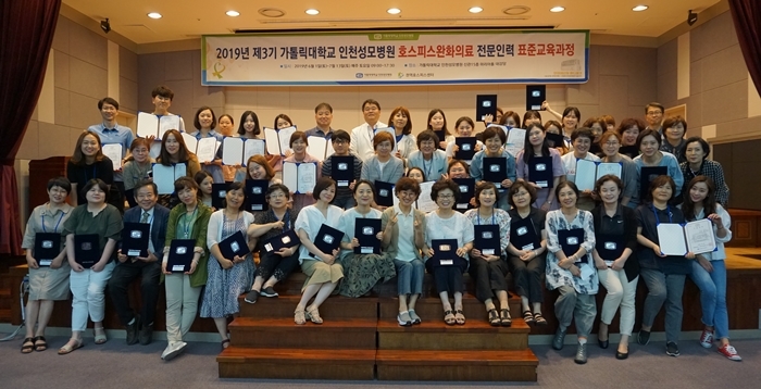 이번 제3기 호스피스·완화의료 전문인력 표준교육은 지난 6월 1일부터 7월 13일까지 총 7주에 걸쳐 60시간 동안 인천성모병원 권역호스피스센터 주관으로 진행됐다. 교육 수료 인원은 의사 6명, 간호사 33명, 사회복지사 15명으로 모두 54명이다.