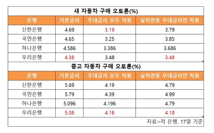 18일 각 은행에 따르면 신한·KB국민·KEB하나·우리 등 주요 4대 시중은행의 17일 기준 오토론 대출 금리는 신차 3.19~4.38%, 중고차 4.18~5.08% 수준이다.
