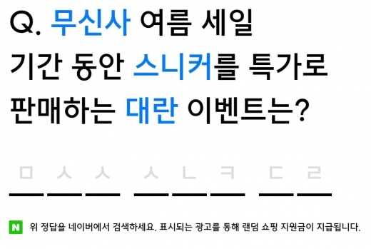19일 오전 8시에 출제된 무신사 랜덤 쇼핑 지원금 첫 번째 퀴즈인 '무신사 여름 세일 기간 동안 스니커를 특가로 판매하는 대란 이벤트는?'의 정답은 '무신사 스니커 대란'이다.
