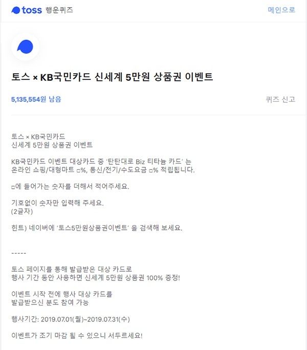 뒤이어 '토스XKB국민카드 신세계 5만원상품권이벤트' 행운퀴즈에는 ‘Easy on 카드’ 및 ‘탄탄대로 Biz 티타늄 카드’ 관련 문제가 제출됐다.