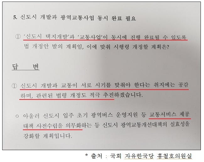 “국토교통부는 신도시 개발과 교통인프라 건설이 서로 시기를 맞춰 동시에 진행 및 완료될 수 있도록 현행 법령을 개정해야 합니다”