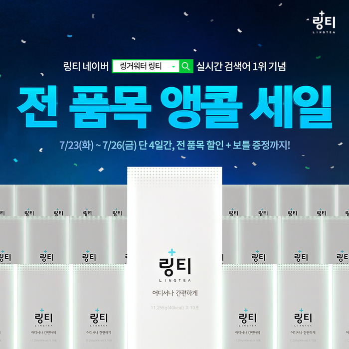 한편 링거워터는 실시간 검색어 1위를 기념하여 전 품목 앵콜 세일을 진행한다. 지난 23일(화)부터 오는 26일(금)까지 단 4일 간 진행하는 이번 세일에서는 최대 45% 할인, 전용 보틀 증정 혜택까지 누릴 수 있다.
