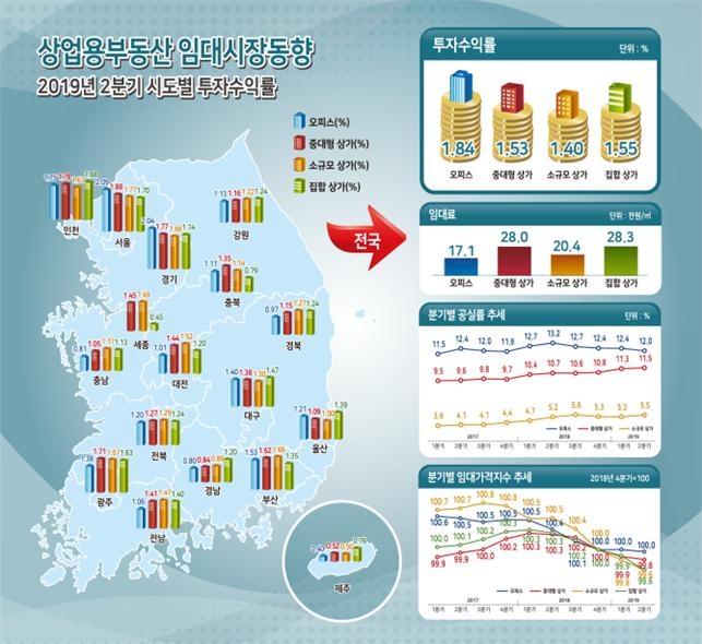 임대이익을 나타내는 소득수익률은 오피스가 1.12%, 중대형상가가 1.04%, 소규모 상가가 0.92%, 집합상가가 1.19%를 기록했다.