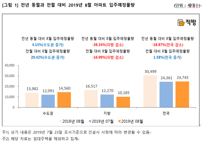 29일 부동산정보서비스 직방에 따르면 8월 전국 아파트 입주예정물량은 2만4745가구로 지난해 동월(3만 499가구)에 비해 18.87%가 감소할 것으로 집계됐다. 수도권은 4.13%가 증가한 1만4560가구, 지방은 38.34% 감소한 1만185가구가 입주를 앞두고 있다.