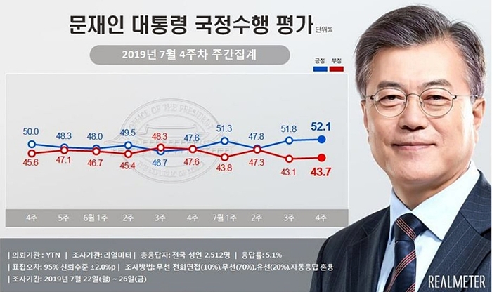 여론조사기관 리얼미터가 29일 YTN의 의뢰로 지난 22일부터 닷새간 전국 19세 이상 유권자 2512명을 대상으로 문재인 대통령 취임 116주차이자 7월 4주차 주간 대통령 국정수행 지지율 집계결과를 발표했다. 이에 따르면 지지율은 지난주보다 0.3%p 오른 52.1%(매우 잘함 30.9%, 잘하는 편 21.2%)를 기록하며 2주 연속 상승했다.