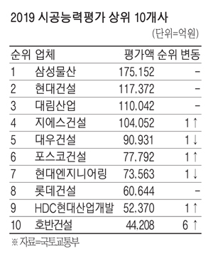 국토교통부는 전국 건설업체를 대상으로 공사 실적, 경영 상태, 기술 능력, 신인도 등을 종합평가한 '2019 시공능력 평가' 결과 삼성물산이 토목건축공사 부문에서 17조5152억원으로 1위를 차지했다고 29일 밝혔다.