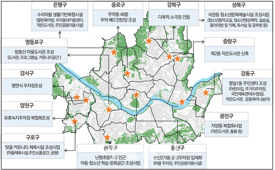 확정된 사업은 ▲용산·양천·강서구 마을주차장 3개소 ▲광진·중랑·영등포구 작은도서관 3개소 ▲강북·종로·구로·강동구 문화체육시설 4개소 ▲관악·성북구 청소년아동복지시설 2개소 ▲은평구 어린이집 1개소 등이다.
