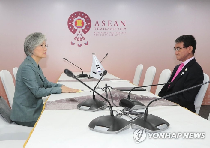 이날 일본의 수출 규제 등 우리 대법원의 강제징용 판결에 대한 보복 조치 후 처음으로 한일 외교장관 회담이 열린 것이다.