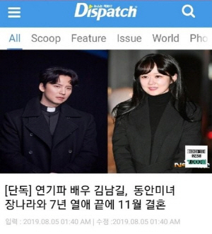 5일 새벽 디스패치는 ‘[단독]연기파 배우 김남길, 동안미녀 장나라와 7년 열애 끝에 11월 결혼’이라는 제목의 기사를 올렸다 삭제했다.