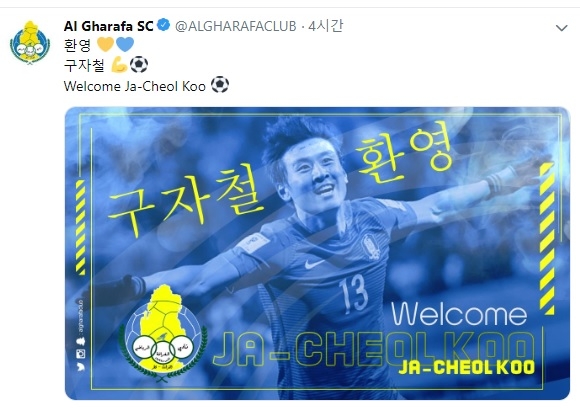 알 가라파는 5일(한국시간) 구단 공식 SNS에 “한국인 미드필더 구자철과 2시즌 동안 계약을 맺었다”며 “그는 곧 팀의 전지훈련 캠프에 참여할 예정”이라고 밝혔다. 또한 글과 함께 게재된 사진에는 “구자철 환영”이라는 메시지를 첨부했다.