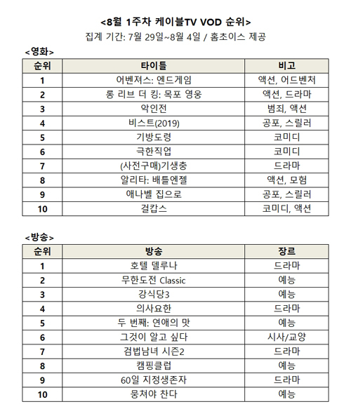 홈초이스는 CJ헬로, 티브로드, 딜라이브, CMB, 현대 HCN 등 전국 케이블TV 가입자들을 대상으로 서비스 한 ‘8월 1주차 영화 및 방송 VOD’ 순위를 발표했다.