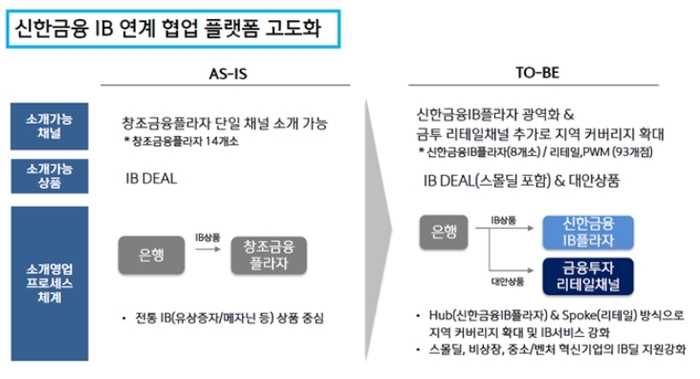 신한금융에 따르면 이번 개편으로 금투 리테일채널 93곳(금투 영업추진부 채널 66개 및 PWM채널 27개)을 IB금융 서비스 제공 채널로 추가해 Hub(신한금융IB플라자) & Spoke(금투 리테일채널) 방식으로 은행, 생명, 캐피탈과의 One Shinhan 협업체계의 확대가 추진된다.