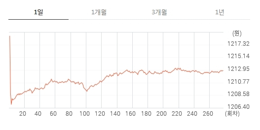 환율은 이날 오전 한동안 2010선 아래에 머물다가 오후 12시 57분 현재 전일보다 10.10원(0.83)내린 1212.90원에 거래되고 있다.