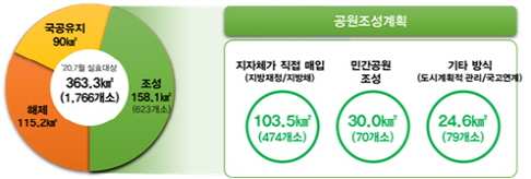 전국 실효 대상 공원 부지인 363㎢ 중 158㎢를 공원으로 조성하는 것을 목표로 2023년까지 지방예산 및 지방채 총 7조3000억원을 투입될 예정이다.