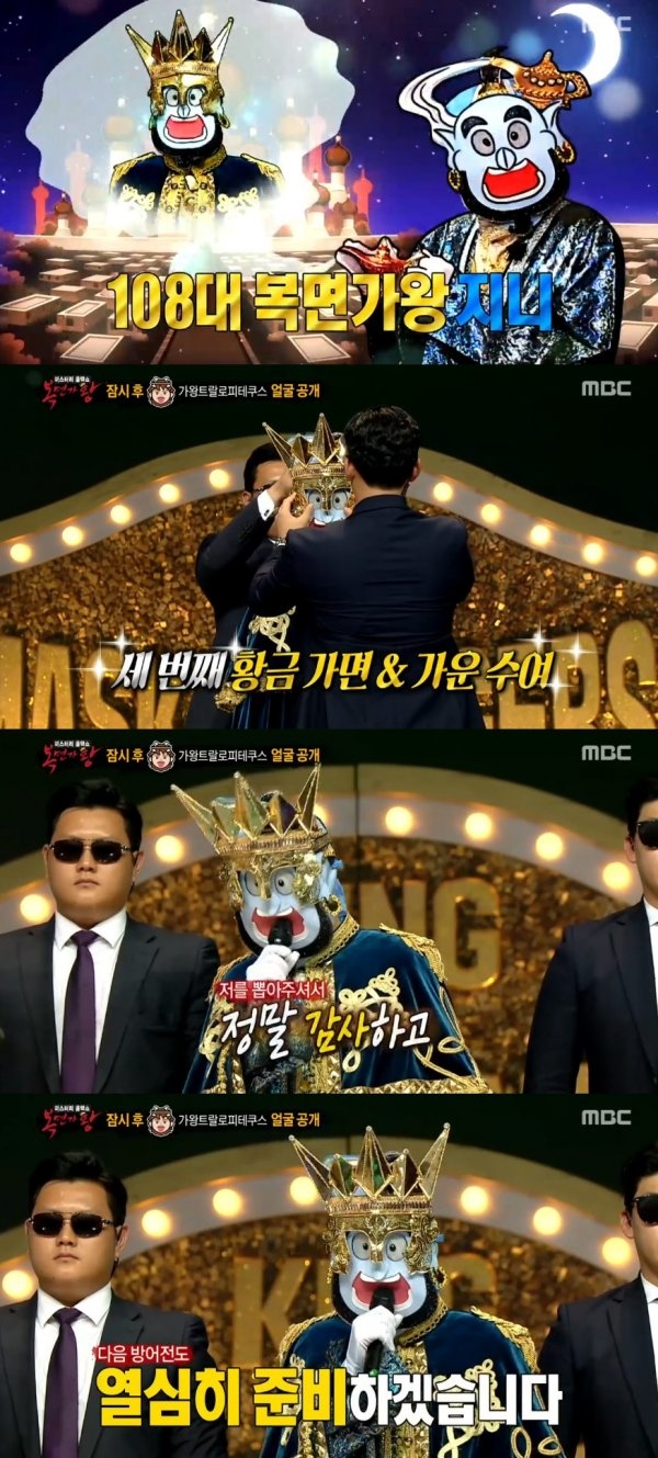 '복면가왕' 노래요정 지니가 108대 복면가왕에 등극했다. 가왕트랄로피테쿠스의 정체는 그룹 장덕철의 덕인으로 밝혀졌다.