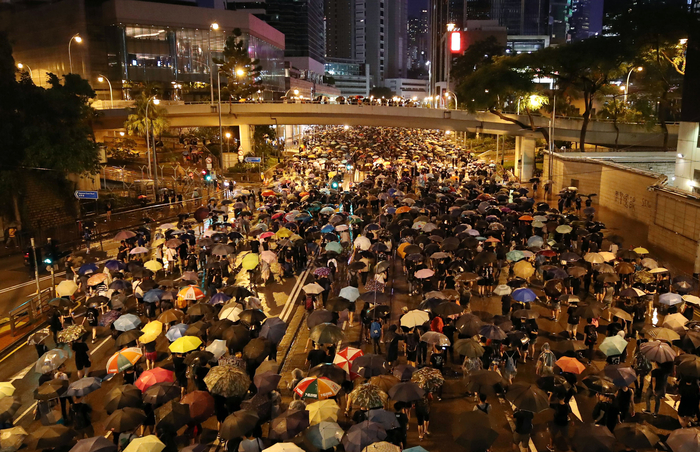18일 오후(현지시간) 홍콩 완차이역 인근에서 송환법에 반대하고 경찰의 강경 진압을 규탄하는 대규모 도심 집회에 참가한 홍콩 시민들이 정부청사 방향으로 행진하고 있다.