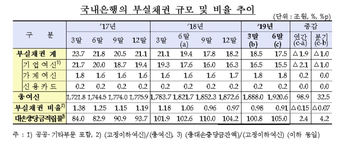 국내은행의 2분기 말 부실채권 규모는 총 17조5000억원으로 전분기보다 1조원(5.5%) 가량 감소했다. 기업여신이 15조5000억원, 가계여신과 신용카드채권이 각각 1조8000억원과 2000억원을 차지했다.