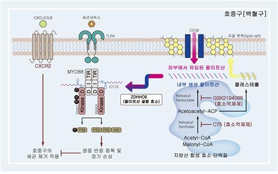 패혈증 악화의 중요한 계기는 염증반응-후폭풍이 발생하는 것이다. 연구 결과, 세균의 내독소에 의해서 백혈구 안의 염증매개 단백질인 ‘MYD88’이 팔미토일화 되는 변형이 중요하다는 것을 규명했다. 팔미토일화(化)란 단백질에 지질(lipid)이 결합되어 단백질의 활성이 변형되는 과정이다.