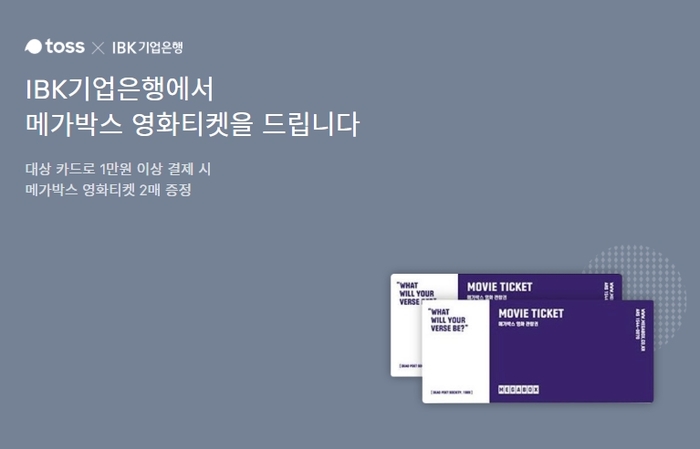한편 토스영화티켓증정이벤트는 8월 31일까지 토스앱에서 기업은행 일상의 기쁨카드를 발급받고, 1만원 이상 결제하면 메가박스 영화 티켓을 2장 지급하는 이벤트다.