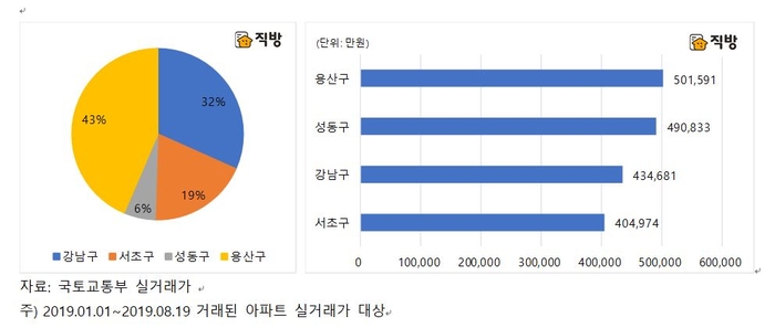 26일 부동산정보서비스 직방이 국토교통부 실거래가격을 분석한 결과, 올해 거래된 아파트 중 거래가격 기준 상위 100위 안에 포함된 아파트는 모두 강남구, 서초구, 성동구, 용산구에 위치한 아파트인 것으로 나타났다.