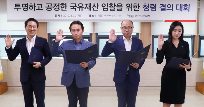 이번 합동 청렴 결의대회는 캠코가 운영하는 공공자산 거래시스템인 온비드를 통한 ▲청렴한 계약 문화 확산 ▲국유재산의 공정하고 투명한 계약체결 ▲알선ㆍ청탁 근절 등에 대한 반부패ㆍ청렴의지를 다짐하고자 마련됐다.
