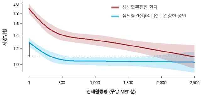 심뇌혈관질환을 갖고 있는 환자에서도 신체활동량이 많을수록 사망위험이 감소한다는 사실이 국내 연구진에 의해 밝혀졌다.